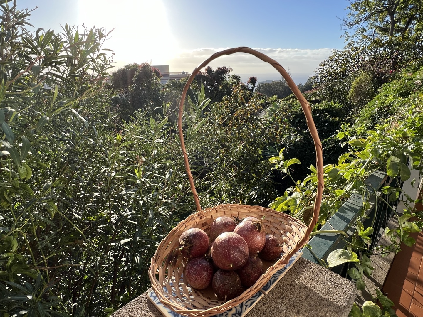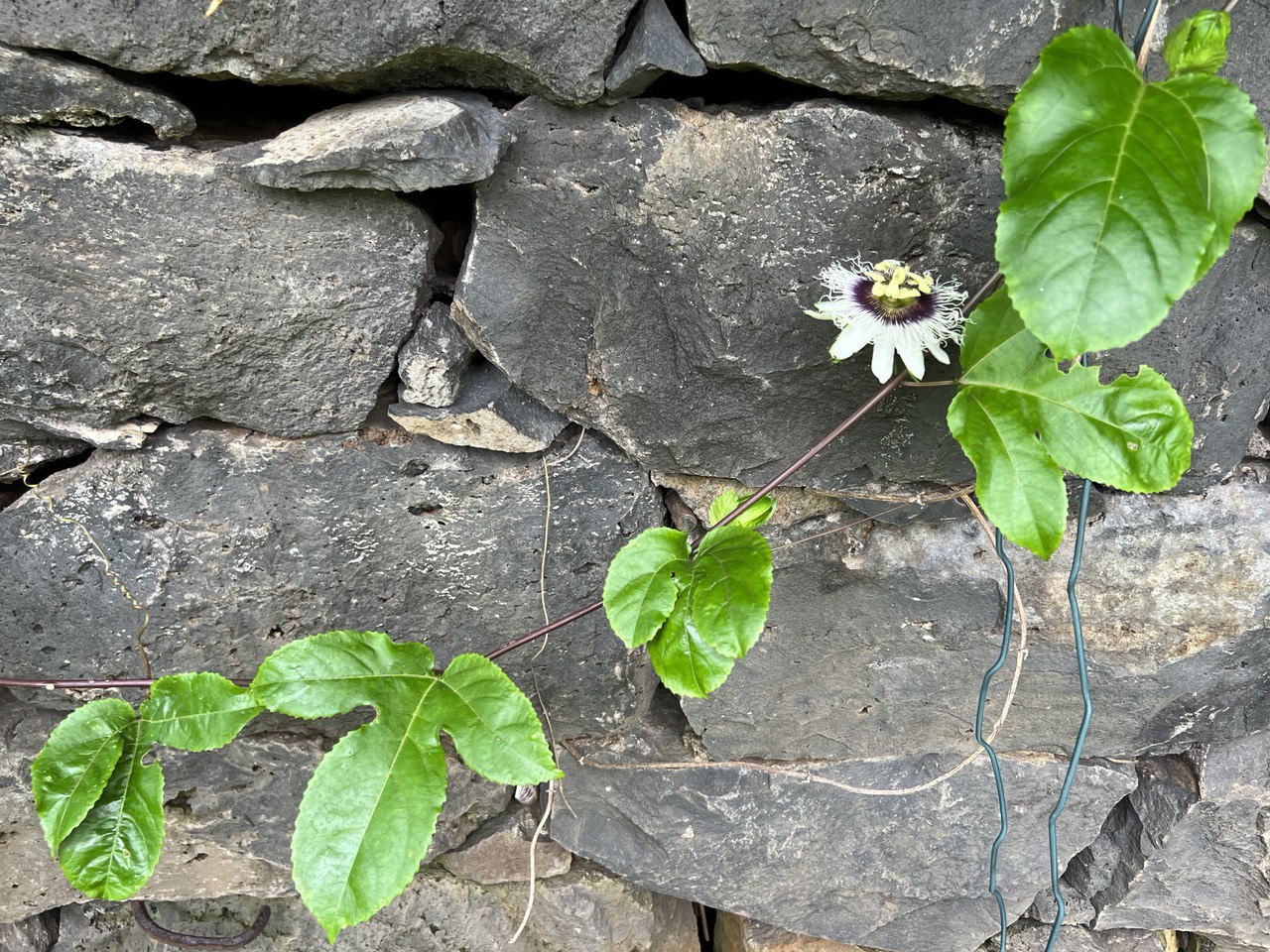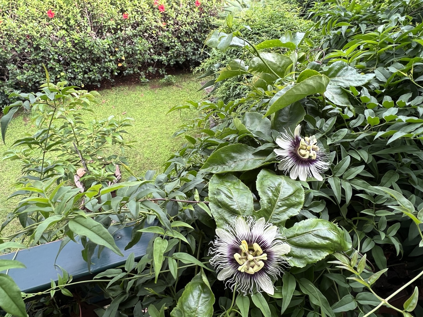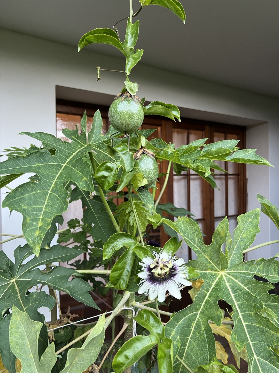 정체불명이었던 이 식물이 알고 보니 '패션후르츠(Passion fruit)', '마라꾸자(Maracuja)' 나무라는 것이었다. 정원사는 이 나무가 우리가 심은 것이 아니어서 꽃도 피지 않을 것이고 절대 열매를 맺지 못할 것이라고 호언장담을 했다. 요즘에는 순수 자연산 과일이 거의 없다고 하며 종자를 구입해서 심어야 제대로 된 열매를 얻는다는 것이었다. 그런데 어느날 흰색, 보라색, 노란색이 어울어진 예쁜 꽃이 피어나니 경이로웠다. 첫 해에는 패션후르츠 꽃들이 만발하다가 말라 떨어졌기 때문에 아예 열매를 기대하지 않았다.