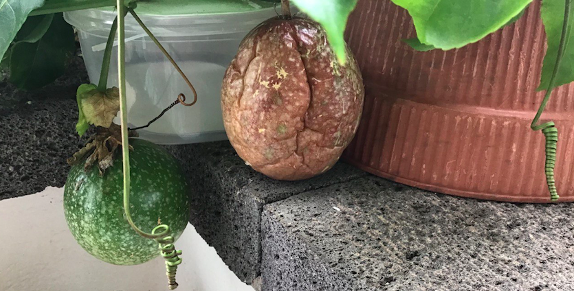 처음으로 열린 팬션후르츠(마라꾸자, Maracuja) 열매를 보니 참 신기했다. 가지에 대롱대롱 매달린 동그란 초록색 열매는 시간이 갈수록 갈색으로 변해갔다. 완전히 익으면 쪼글쪼글해지고 스스로 떨어질때까지 기다려야 한다. 익어서 바닥에 떨어졌을 때 수확해야한다.