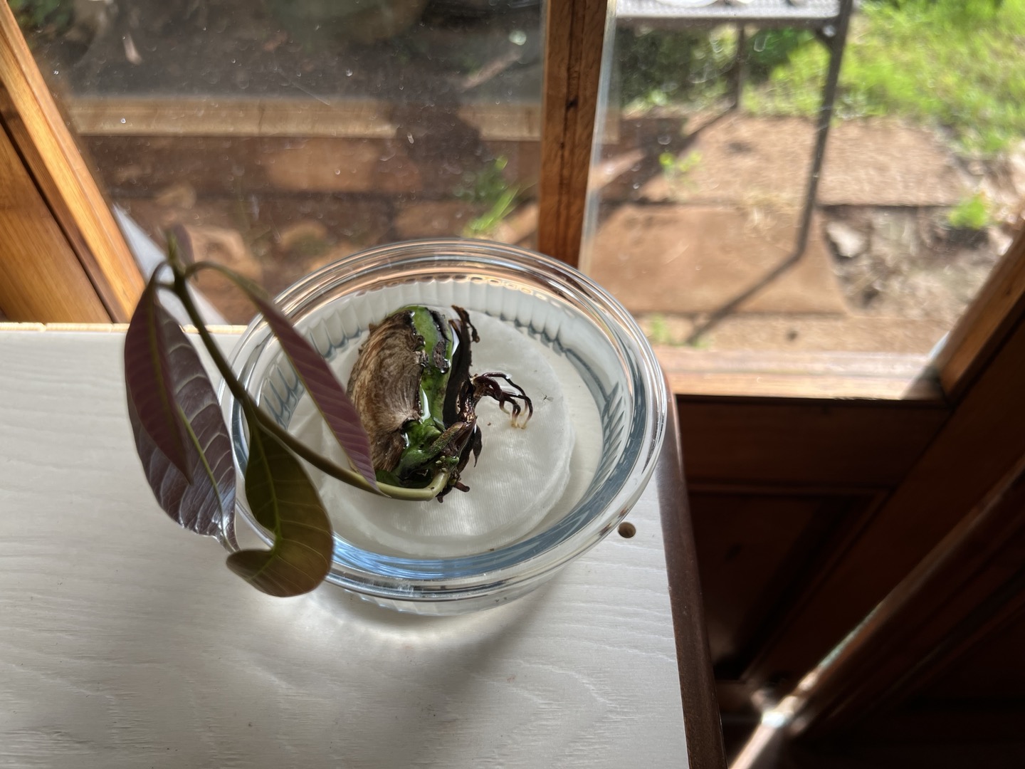 저녁 디저트로 망가를 맛있게 먹고 나서 그 씨앗을 유리그릇에 올려두었더니 싹이 돋아나 자라기 시작했다. 유리그릇에 솜을 깔고 그 위에 망가 씨를 올린 다음 물에 반쯤 잠기도록 놓아둔 것이다. 돌처럼 딱딱한 씨에서 싹이 돋아나는 것이 신기하기만 하다.