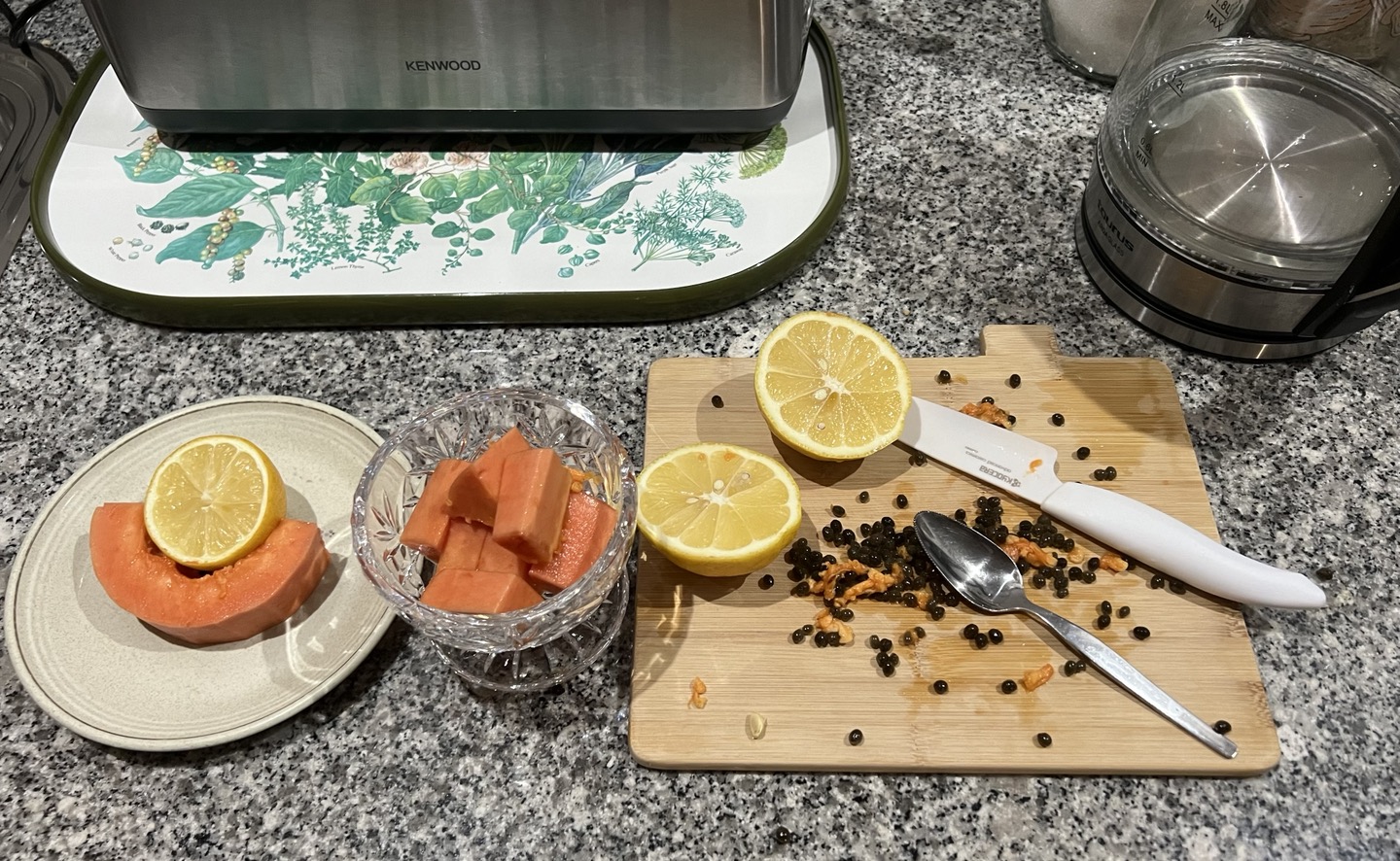 나는 매일 아침식사로 레몬 1개를 즙을 내어 파파야를 넣어서 먹는다. 레몬을 반으로 쪼개서 스푼으로 파면 쉽게 레몬즙을 추출할 수 있다. 특히 '유기농 레몬'이라는 것이 크기는 작아도 당도가 더 높은거 같다. 파파야가 가진 단맛이 레몬의 신맛을 희석시켜주어서 달콤한 레몬 맛을 즐길 수 있다. 최근에 설탕 한 티스푼을 곁들여 먹기 시작했는데 당도를 높인다는 목적보다 설탕이 첨가되었을 때 맛의 묘미가 다르기 때문이다.