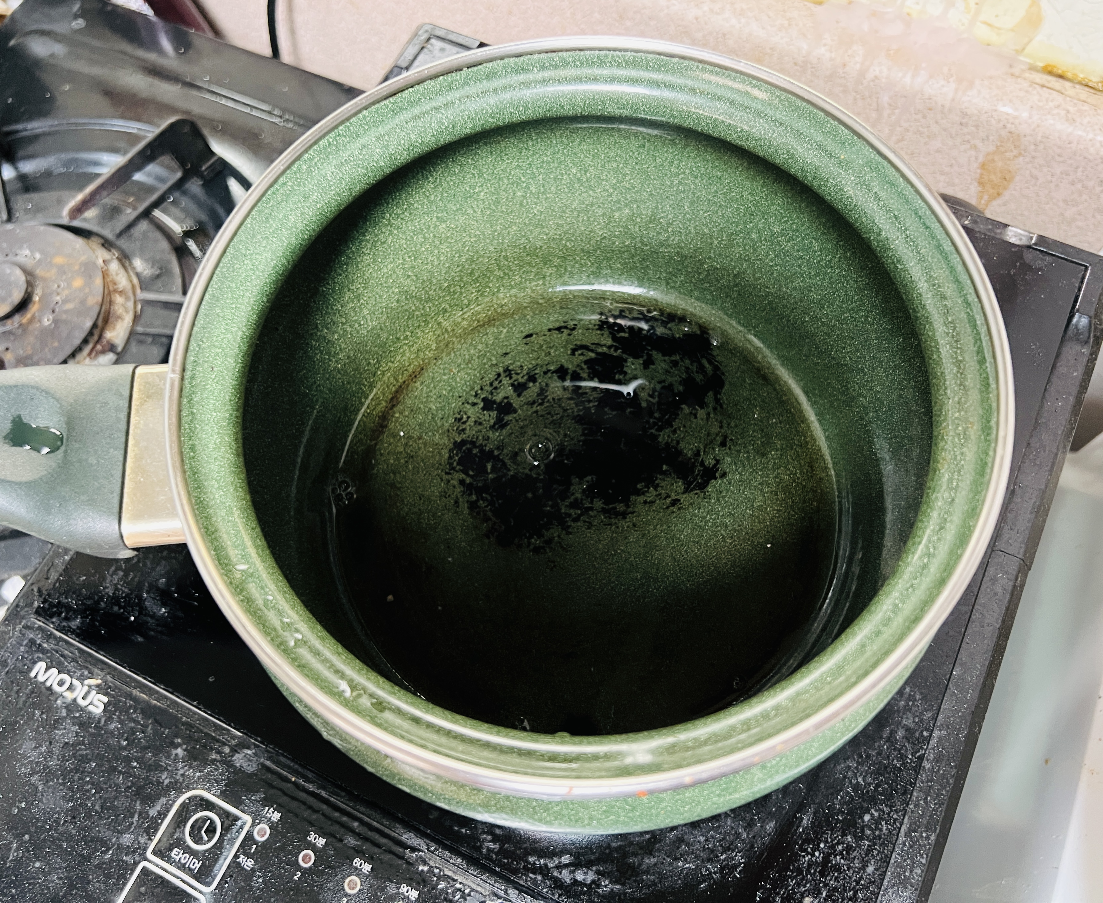 뚜껑을 열자마자, 탄 냄새와 코팅 냄비에 착 달라붙은 시커먼 잔재들.